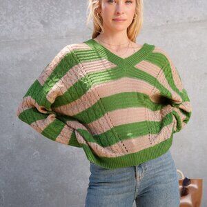 green striped sweater, oversized v-neck sweater, cozy knit pullover, bold stripe sweater, fall layering sweater, winter cozy top, casual oversized knit, boutique striped sweater, chunky knit pullover, boho chic sweater