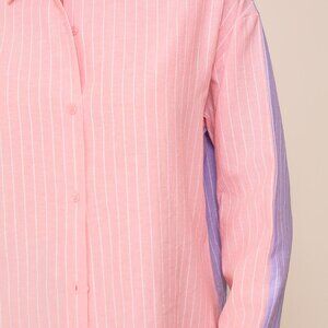 A wearable masterpiece that will captivate every fashion-forward woman. This extraordinary piece is designed to redefine your style, effortlessly blending sophistication with a hint of playful charm. Crafted with meticulous attention to detail, the shirt features a mesmerizing pattern of alternating stripes that dance across the fabric, creating a uniquely captivating visual feast. The button-down design adds a touch of classic elegance, while the lightweight and breathable fabric ensures all-day comfort. Whether it's a chic office ensemble or a casual weekend look, this shirt effortlessly transitions from one occasion to the next. Embrace the endless possibilities of style as you embark on a fashion journey that is as bold and dynamic as you are. Indulge in the timeless glamour of our Back and Forth Striped Button Down Shirt and elevate your wardrobe to new heights of fashion excellence.