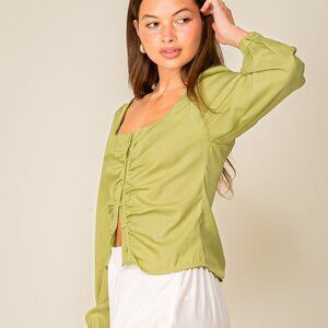LUMIERE Light Green Ruched Button-Front Top, Square Neck Long Sleeve Blouse