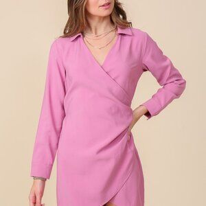 Pink Wrap Mini Dress with Long Sleeves, Collared Surplice Style, Chic Party or Brunch Outfit