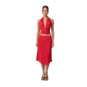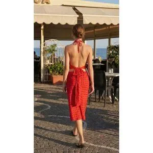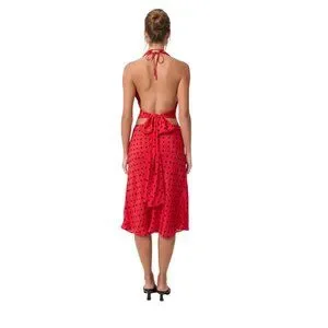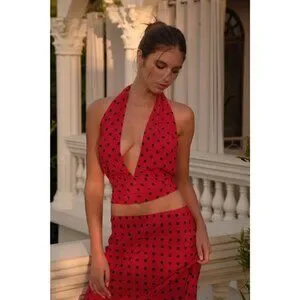 The Luna Top is a halter-style wrap top featuring a V-neckline with adjustable ties at the neck and back.