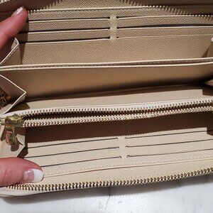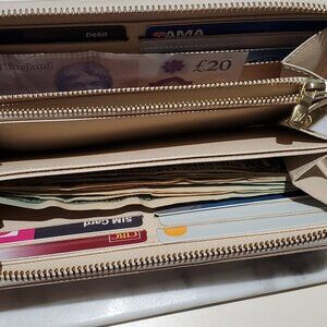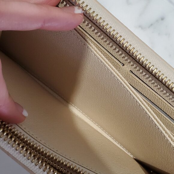 The wallet unzips to reveal a well-organized interior in grained leather with a variety of pockets, compartments and card slots.