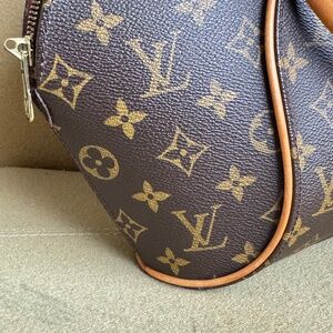 In addition, the LV zipper has a little bit of tarnishing but barely noticeable, minor scuff marks on leather patina on the handle, piping and leather trim. Lastly, one of handle of the bags has some cracking on it.