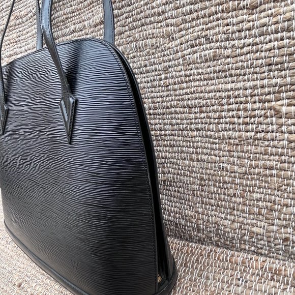 This spacious shoulder bag features an epi leather body, flat straps, a top zip closure, and an interior zip pocket.