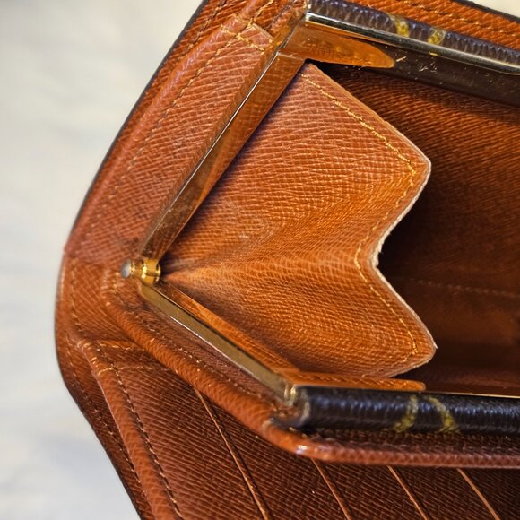 A bifold wallet features a distinctive kiss-lock coin purse and typically includes a bill compartment, multiple card slots , a kiss-lock coin pocket, and additional pockets for receipts or notes.