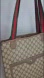 Monogram PVC-coated canvas with brown leather trim, featuring the signature red and green "Sherry Line" web stripe on the handles, which are in excellent condition.