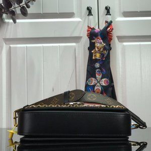 Inspired by Louis Vuitton’s vintage Cartouchière bag from 1975, Nicolas Ghesquière introduces the Neo Saint Cloud handbag for Fall-Winter 2020. The bag’s edgy design combines Monogram canvas with smooth black leather and is completed with a silver-color buckle and detailing. The wide strap and short cross-body carry give it a distinctly fashionable look.
