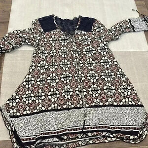 [L-XL] Simply Noelle LS pullover rayon Blue white, and black print A-line tunic