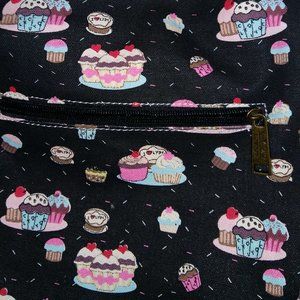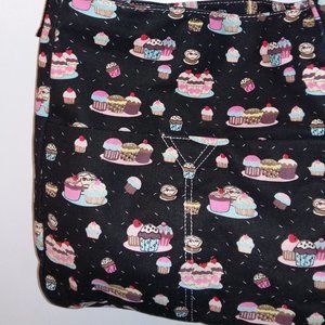 LYDC LONDON NWOT fun printed cupcake purse. Adjustable black strap. Excellent condition - never been used. 2 pouches in front with snap closure, 1 zippered pouch in back, 1 zipper on top. Inside has 2 cell phone size open pockets & 1 small zippered pocket. Very lightweight. 14"w x 13-1/2"h.