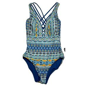 La Blanca Sz 4 Swimsuit Reversible One Piece Blue Mosaic UPF 50+ Boho Retro