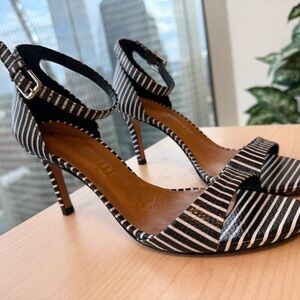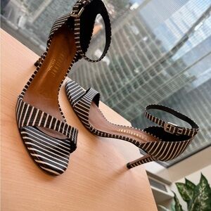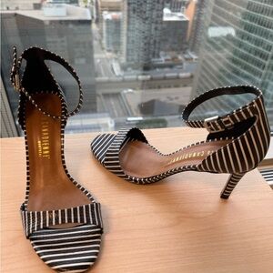 La CANADIENNE's size 38!(7.5-8) mint condition black and white striped heels. Featuring a chic slingback strap with studded detailing and a medium-height heel, these shoes are designed for both elegance and practicality. The open toe design and nautical-inspired pattern make them a standout choice for any stylish occasion.