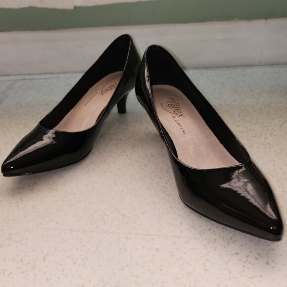 Canadian Brand! La Chateau Black Patent Pumps Moda Reflex.Size 8.5. Excellent preloved condition only barely worn. Real Leather lining man made uppers. 2 inch heels. Has original box included.