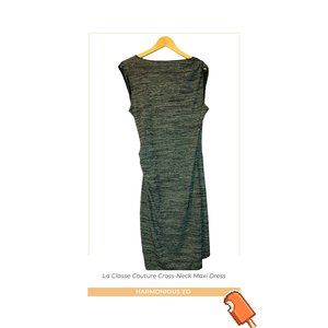 Cross-Neck Maxi Dress in Static grey/ deep onyx. The fabric stretches for curvy people, very forgiving in the hips and chest area. Sleeveless, Very comfortable. Can be worn for casual or dressed up. Very soft with stretch.