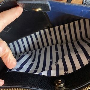 La Diva Italian Design Navy & Black Handbag Purse in excellent condition. It is a faux leather. Blue & white stripped lining with gold accents.