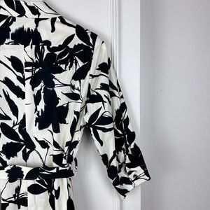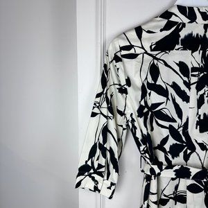 This shirtdress from La Fée Maraboutée is made with a crisp cotton poplin in an all-over White and Black leaf print, and features 3/4 sleeves with buttoned cuffs, a collared neckline, a full front button placket, side seam pockets, a self-tie waist, and flaring on the knee-length skirt.