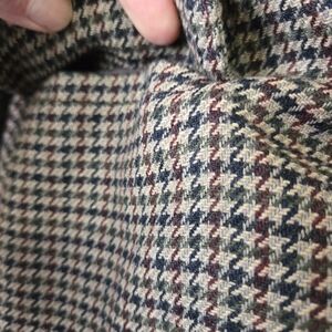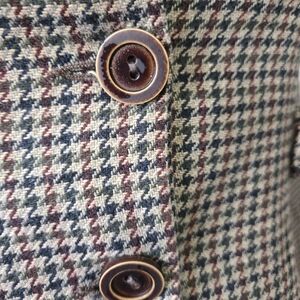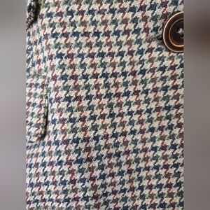 Beautiful wool blend houndstooth jacket with cream, deep red and green. Side belts with buttons. Black elbow patches. two front buttoned closure. Two front pockets still sewn from purchase. Fully lined in a silky brown.