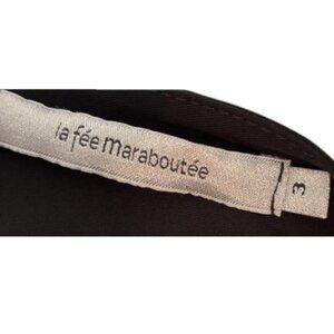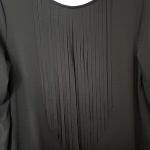 A black, long-sleeved shift dress from the brand La Fee Maraboutee. Featuring a distinctive fringed detail on the upper back. The shift silhouette offers a classic and comfortable fit, while the pleated back adds a distinctive and sophisticated element, reflecting the brand's focus on careful workmanship and unexpected details. The black color further enhances its versatility and timeless appeal, fitting within a wardrobe designed to meet various needs.