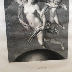 La Fortune by Guido Reni (Peint par Guido). Print made by Ernst Morace (Gravé par Morace). Draughtsman: Jean-Pierre Granger (Dessiné par Granger). Copy in the British Museum (#1856,0712,463). Custom framed by Galerie Rolland (Montreal). Frame measures 28" x 28". Purchased at auction.