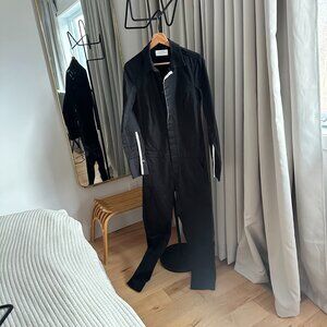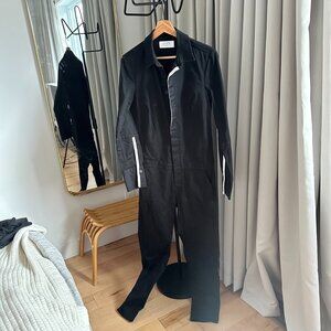 Black La Ligne straight-leg jumpsuit with pointed collar, long sleeves, dual seam pockets and concealed button closures at front.