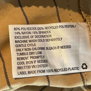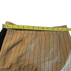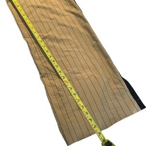 Made from a soft, lightweight fabric blend with that includes spandex, these trousers are designed in a solid tan color with black vertical stripes.
