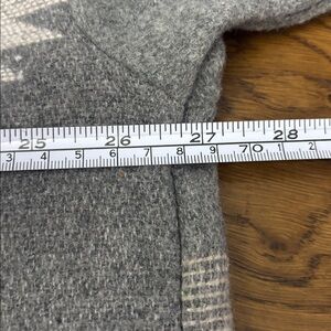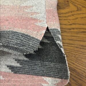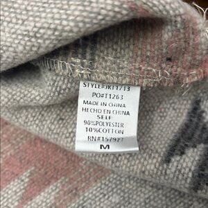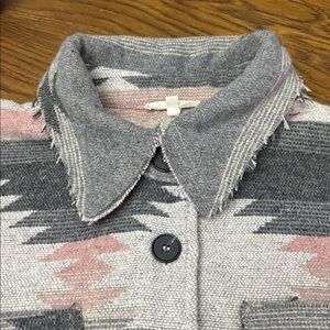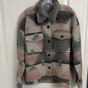Aztec Pattern Button Up Shacket by La Miel in muted greys, beiges and pinks in Size MED (oversize). Buttons up with 5 buttons and two chest pockets with buttons . Distressed collar and hem and distressing in pockets . Slightly lower at back hem and two slits on bottom hem . Very boho and pretty . Fabric is 90% polyester and 10 % cotton .