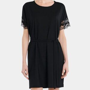 Cut with a relaxed silhouette, this modal jersey nightgown dress is breathable and soft against skin. Designed with a simple round-neck silhouette, it is trimmed with delicate embroidered tulle to the sleeves.