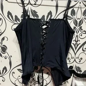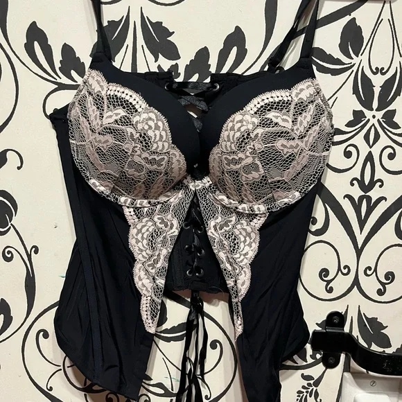 Chic black bustier with delicate cream lace overlay. Features lace-up front for a flattering fit. Ideal for a stylish intimate look.