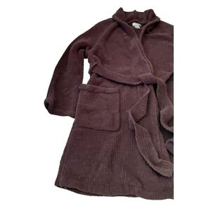 Luxurious dark brown robe. Soft fabric. Belted waist. Two front pockets.
