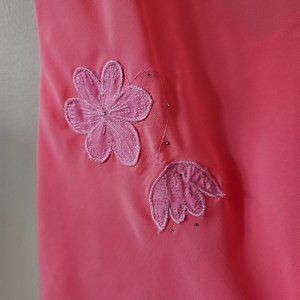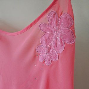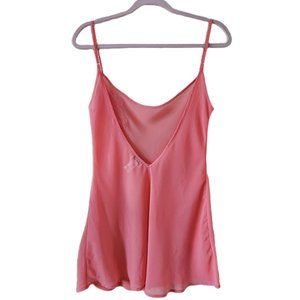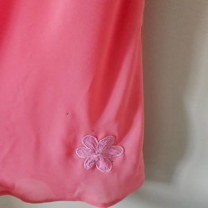 Elegant pink chemise with delicate floral lace accents. Spaghetti straps for a comfortable fit. Perfect for a stylish and cozy night.