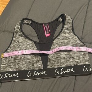 Discover the perfect blend of comfort and support with La Senza's Gray and Black Sports Bra. Crafted from a stretchy, athletic material, this bra features a wide supportive band and a classic racerback design, ideal for both athletic activities and everyday wear. The heathered gray fabric with black detailing adds a touch of style, making it a versatile addition to your intimates collection. Has removable inserts