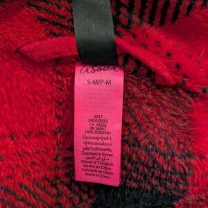 Red buffalo check, super soft short long-sleeved robe with interior and exterior ties. Size small-medium, 100% polyester.