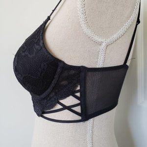 Lightly padded gorgeous lace bralette with criss cross detailing on the sides, and mesh backing. Barely worn, in flawless condition.