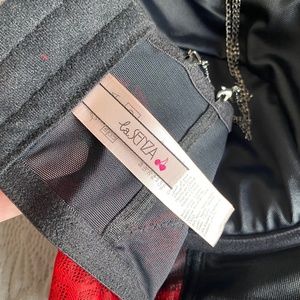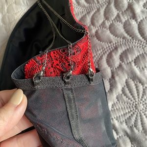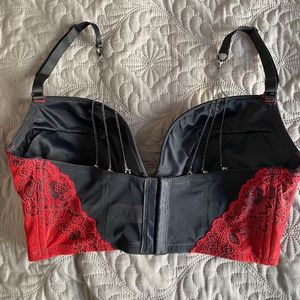 EUC La Senza cropped bustier. Black with red lace overlay. Has triple chain straps that attache to band with lobster clasps. Lined cups have little pouches to insert more padding, if you like.