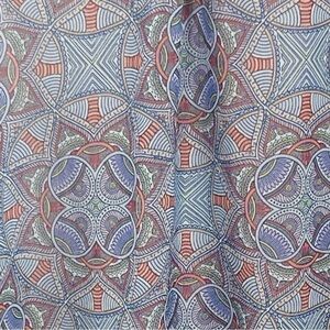 Soft blue with geometric abstract design in lavender purple, lime green, peach, red orange, blue