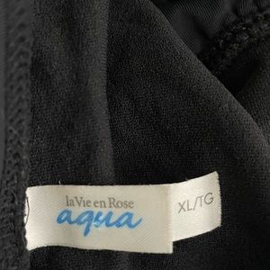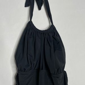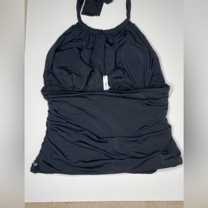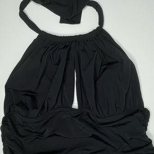 Elegant black halter swim top. Features ruched detailing. Perfect for a stylish beach day.