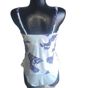 Stylish tankini set in a blue and white leaf print design. Has removable cups and adjustable straps. Size large