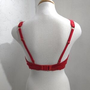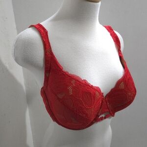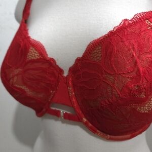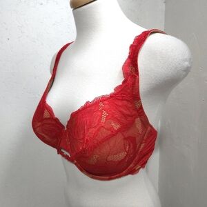 Experience comfort and style with this elegant red lace bra. Perfect for any occasion.La Vie En Rose | Elegant Red And Tan Lace Padded Bra 36DD
