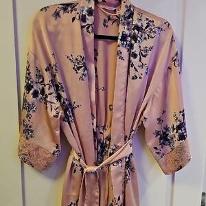 Elegant satin robe with floral design. Features a tie belt and lace trim on sleeves. Perfect for lounging.