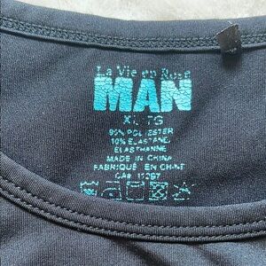 Performance-ready La Vie en Rose MAN men’s activewear t-shirt in black with blue seam accents. Size XL. Made with a polyester and elastane blend for stretch and comfort, perfect for workouts, sports, or casual wear. Good used condition with no noticeable flaws.