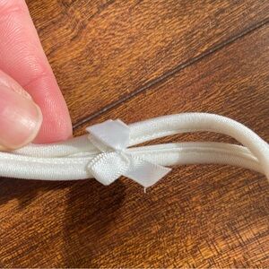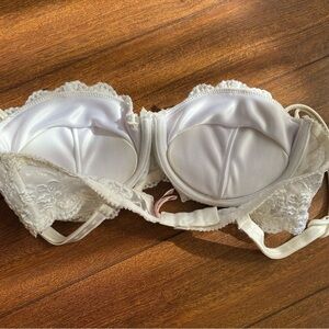 Worn one time, walking around at home. White lace underwire bra featuring floral embroidery and adjustable straps with white bows (another one in the middle of the new front). Molded cups so full coverage. 36D. Selling because I’m too paranoid with white garments.