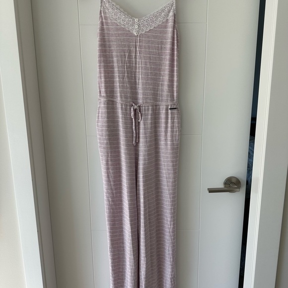 Chic pink striped jumpsuit with lace detail. Comfortable and stylish for lounging.
