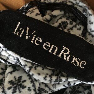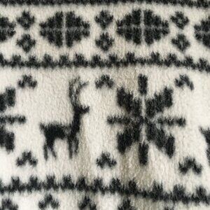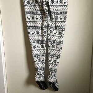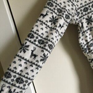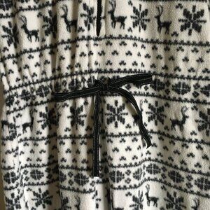 Very good preowned vintage Y2K condition, footed, hooded, soft fleece onesie in white by La Vie En Rose featuring a fair-isle-like pattern of a stag/deer and snowflakes in what appears to be black. Not sure, but I see just the tiniest hint of blue in the black. Or else I must get my eyes checked. Very cute, super comfortable and perfect for staying cozy indoors during cold winter weather. Worn between 10-15 times or so.