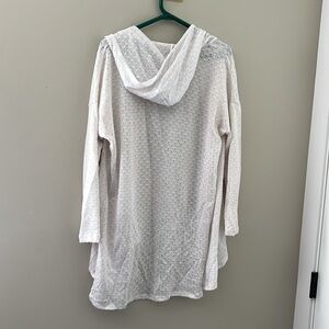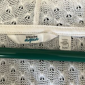 A delicate white lace cardigan from La vie en Rose featuring an open front design with intricate lace detailing. Perfect for layering over casual or formal outfits. Pit to pit is 22 1/2 inches top to bottom is 32 inches