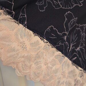 Black, soft robe with pink flower outline print and lace details. Size medium, a bit stretchy, and can be cinched with the included sash/belt. Length is to mid-thigh. Only worn once or twice, perfect condition. Made from a 90% polyester and 10% elastane fabric.