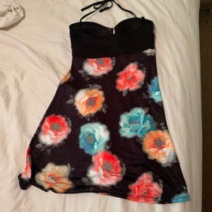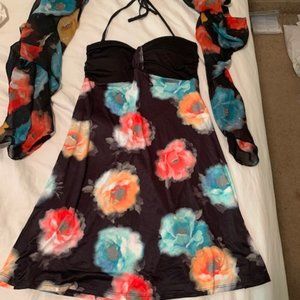 1. Floral dress, black with red, orange and turquoise flowers. Can go into water, or great to toss on for meals inside. Strap comes off. Fairly stretchy - about 100 cm stretched a bit. Size Medium