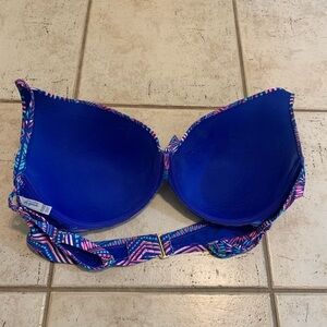 Dive into summer with this vibrant and stylish bikini top from La Vie en Rose Aqua! This D-XX Large (D-TT Grand on tag) top features a beautiful multi-colored geometric pattern in shades of blue, pink, and teal. It has adjustable straps and a gold-tone clasp closure at the back for a comfortable and secure fit. Perfect for your next beach vacation, pool day, or just soaking up the sun.
