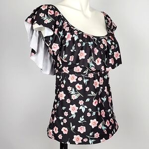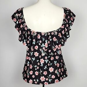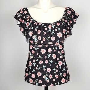 La Vie en Rose Bathing Suit Top Off the Shoulders Ruffle Floral Pink Black Sz L