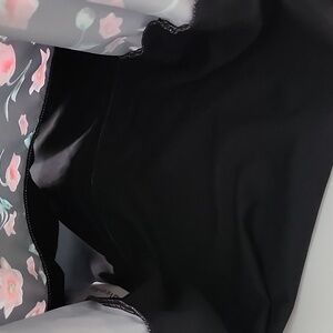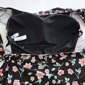 New with tags, La Vie en Rose bathing suit top, which can be worn on or off the shoulders with a pretty ruffle little pink floral print on black, size Large.