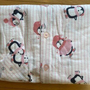 White and Pink striped jammies with ice-skating penguins. One breast pocket.