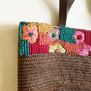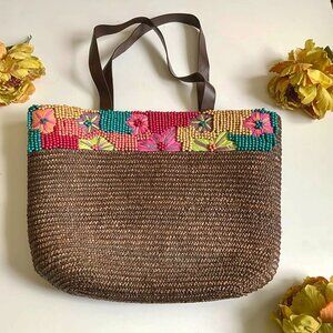 La Vie en Rose Large Pre-owned Brown Beaded Woven Straw Beach Top Handle Bag